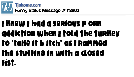 X says I knew I had a serious p orn addiction when I told the turkey to "take it b itch" as I rammed the stuffing in with a closed fist.
