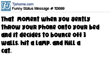 - # 194855 That moment when you gently throw your phone onto your bed and it decides to bounce off 3 walls, hit a lamp and kill a cat.