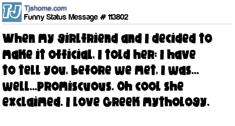 X When my girlfriend and I decided to make it official, I told her: I have to tell you, before we met, I was... well...promiscuous. Oh cool she exclaimed. I love Greek mythology.