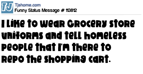 X I like to wear Grocery store uniforms and tell homeless people that I'm there to repo the shopping cart.