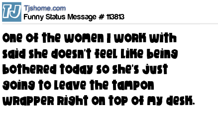 X One of the women I work with said she doesn't feel like being bothered today so she's just going to leave the tampon wrapper right on top of my desk.