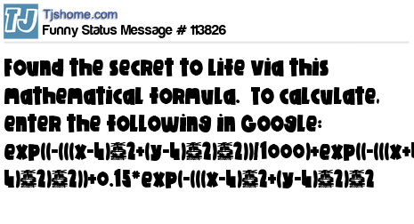 X has found the secret to life via this mathematical formula. To calculate, enter the following in Google: exp((-(((x-4)^2+(y-4)^2)^2))/1000)+exp((-(((x+4)^2+(y+4)^2)^2))/1000)+0.15*exp(-(((x+4)^2+(y+ 4)^2)^2))+0.15*exp(-(((x-4)^2+(y-4)^2)^2