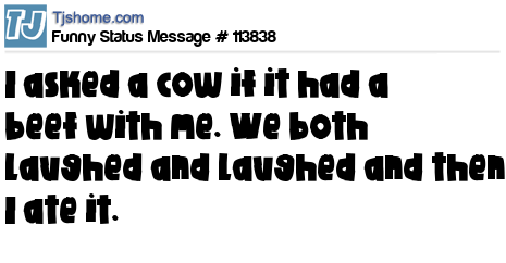 X I asked a cow if it had a beef with me. We both laughed and laughed and then I ate it.