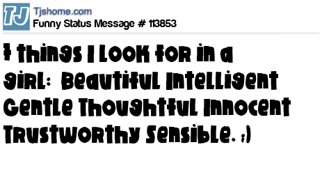- # 104680 7 things I look for in a girl: Beautiful, Intelligent, Gentle, Thoughtful, Innocent, Trustworthy, Sensible.