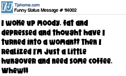 X says I woke up moody, fat and depressed and thought have I turned into a woman?? Then I realized I'm just a little hungover and need some coffee. Whew!!