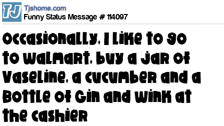 X Occasionally, I like to go to walmart, buy a jar of Vaseline, a cucumber and a Bottle of Gin and wink at the cashier