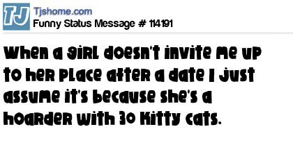 X says When a girl doesn't invite me up to her place after a date I just assume it's because she's a hoarder with 30 kitty cats.