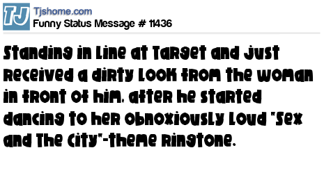 X is standing in line at Target and just received a dirty look from the woman in front of him, after he started dancing to her obnoxiously loud "Sex and The City"-theme ringtone.