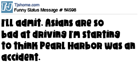 X I'll admit. Asians are so bad at driving I'm starting to think Pearl Harbor was an accident.