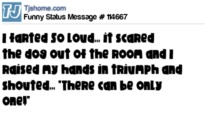 X I farted So loud,,, it scared the dog out of the room and I raised my hands in triumph and shouted,,, "There can be only one!"