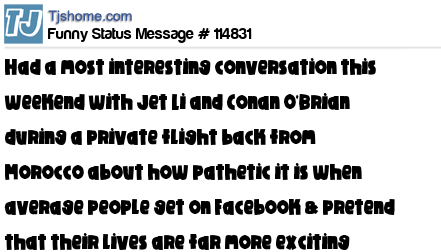 X Had a most interesting conversation this weekend with Jet Li and Conan O'Brian during a private flight back from Morocco about how pathetic it is when average people get on Facebook & pretend that their lives are far more exciting than they actually are.