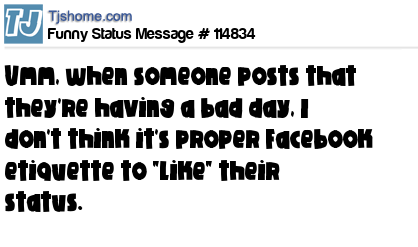 X Umm, when someone posts that they're having a bad day, I don't think it's proper Facebook etiquette to "like" their status.