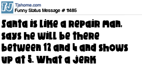 X says Santa is like a repair man, says he will be there between 12 and 4 and shows up at 5. What a jerk