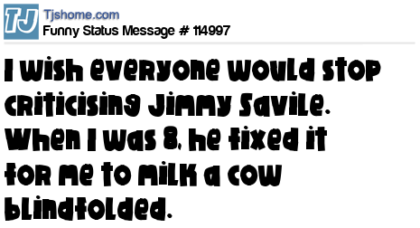 X I wish everyone would stop criticising Jimmy Savile. When I was 8, he fixed it for me to milk a cow blindfolded.