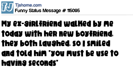X my ex-girlfriend walked by me today with her new boyfriend, they both laughed, so I smiled and told him "you must be use to having seconds"
