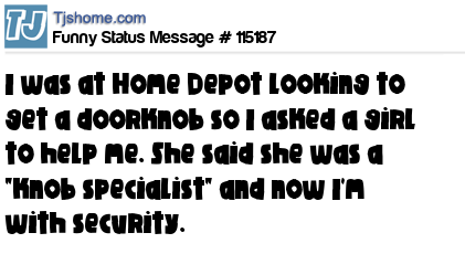 X says I was at Home Depot looking to get a doorknob so I asked a girl to help me. She said she was a "knob specialist" and now I'm with security.