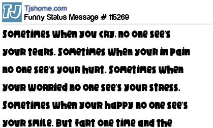 - # 149359 Sometimes . . . When you cry, no one sees your tears. Sometimes . . . When you are in pain, no one sees your hurt. Sometimes . . . When you are worried, no one sees your stress. Sometimes . . . When you are happy, no one sees your smile. But just fart one