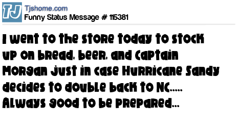 X is I went to the store today to stock up on bread, beer, and Captain Morgan just in case Hurricane Sandy decides to double back to NC..... Always good to be prepared...