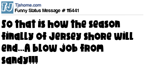 - # 115447 Hurricane Sandy is Mother Nature's way of preventing another MTV Jersey Shore cast from happening. She's had enough!!!