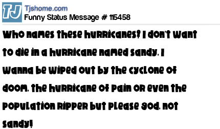 - # 115267 Why don't they give hurricanes epic names like cyclone of doom or the fate fairy instead of frikken Sandy.....