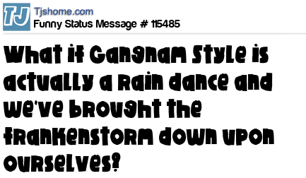 X says What if Gangnam Style is actually a rain dance and we've brought the frankenstorm down upon ourselves?