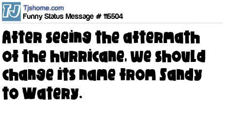 X is After seeing the aftermath of the hurricane, we should change its name from Sandy to Watery.