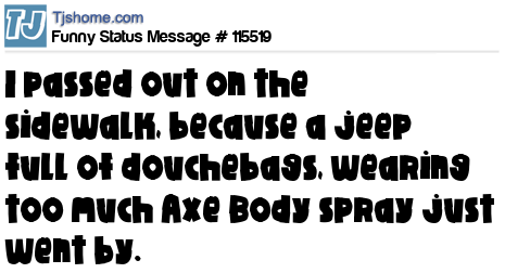 X says I passed out on the sidewalk, because a jeep full of douchebags, wearing too much Axe Body spray just went by.