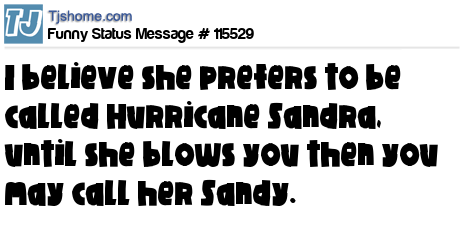 - # 115458 Who names these hurricanes? I don't want to die in a hurricane named sandy, I wanna be wiped out by the cyclone of doom, the hurricane of pain or even the population ripper but please god, not sandy!