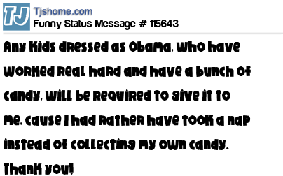 X says Any kids dressed as Obama, who have worked real hard and have a bunch of candy, will be required to give it to me, cause I had rather have took a nap instead of collecting my own candy. Thank you!