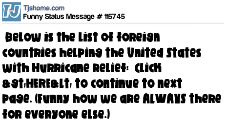 X is Below is the list of foreign countries helping the United States with Hurricane relief: Click >HERE< to continue to next page. (Funny how we are ALWAYS there for everyone else.)