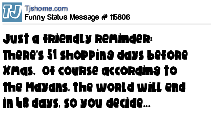 X says Just a friendly reminder: There's 51 shopping days before Xmas. Of course according to the Mayans, the world will end in 48 days, so you decide…