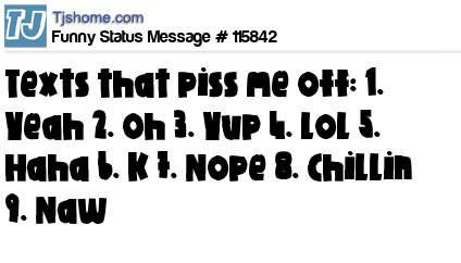X is Texts that piss me off: 1. Yeah 2. Oh 3. Yup 4. Lol 5. Haha 6. K 7. Nope 8. Chillin 9. Naw