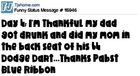 X is Day 4; I'm Thankful my dad got drunk and did my mom in the back seat of his 64 Dodge Dart...Thanks Pabst Blue Ribbon