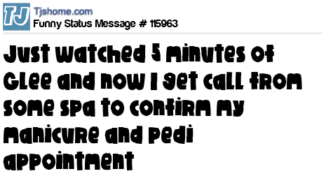 X says Just watched 5 minutes of Glee and now I get call from some spa to confirm my manicure and pedi appointment