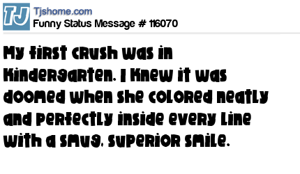 - # 172926 My first crush was in kindergarten. I instantly knew I was doomed when she colored Neatly and Perfectly inside every line with a smug, superior smile