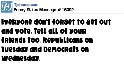 X Everyone don't forget to get out and vote. Tell all of your friends too. Republicans on Tuesday and Democrats on Wednesday.