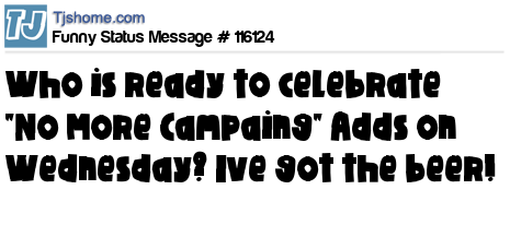 X Who is ready to celebrate "No More Campaing" Adds on Wednesday? Ive got the beer!
