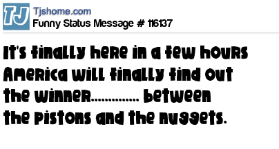 X says It's finally here in a few hours America will finally find out the winner.............. between the pistons and the nuggets.