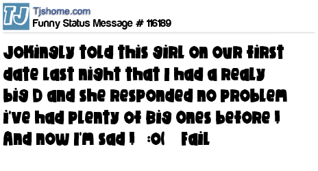 X Jokingly told this girl on our first date last night that I had a realy big D and she responded no problem i've had plenty of Big Ones before ! And now I'm sad ! :o( Fail