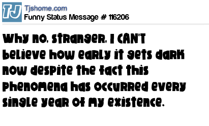 X is Why no, stranger, I CAN'T believe how early it gets dark now despite the fact this phenomena has occurred every single year of my existence.