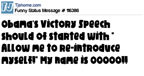 X Obama's Victory Speech should of started with " Allow me to re-introduce myself!" My name is OOOOO!!