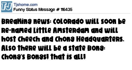 X Breaking news: Colorado will soon be re-named Little Amsterdam and will host Cheech and Chong Headquarters. Also there will be a state Bong: Chong's Bongs! that is all!
