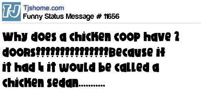 X says Why does a chicken coop have 2 doors???????????????Because if it had 4 it would be called a chicken sedan...........