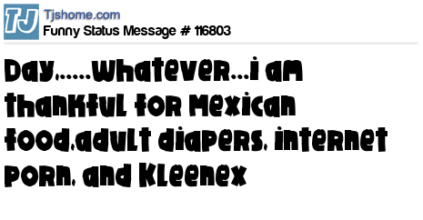 X is Day,.....whatever...i am thankful for Mexican food,adult diapers, internet porn, and Kleenex
