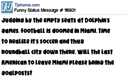 X Judging by the empty seats at Dolphin's games, football is doomed in Miami. Time to realize it's soccer and thug roundball city down there. Will the last American to leave Miami please bring the goalposts?