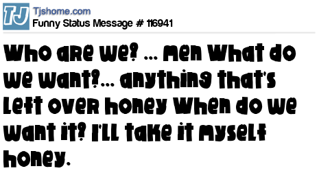 X Who are we? ... men What do we want?... anything that's left over honey When do we want it? I'll take it myself honey.