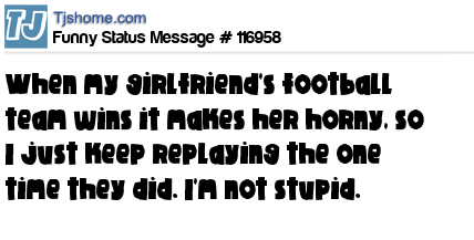 X says When my girlfriend's football team wins it makes her horny, so I just keep replaying the one time they did. I'm not stupid.