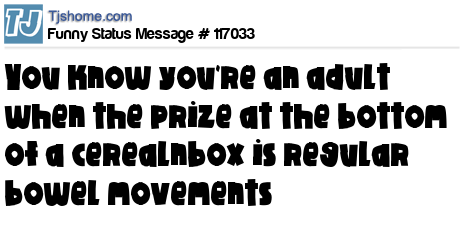 X says You know you're an adult when the prize at the bottom of a cerealnbox is regular bowel movements