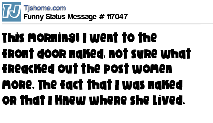 - # 80009 Scared the postman by going to the door naked. I'm not sure what scared him more, my naked body or the fact that I knew where he lived.
