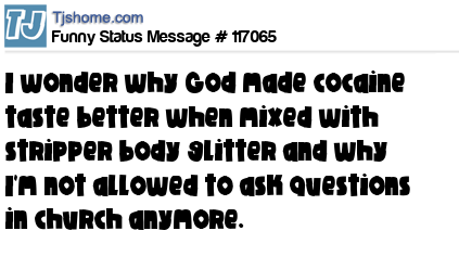 X says I wonder why God made cocaine taste better when mixed with stripper body glitter and why I'm not allowed to ask questions in church anymore.